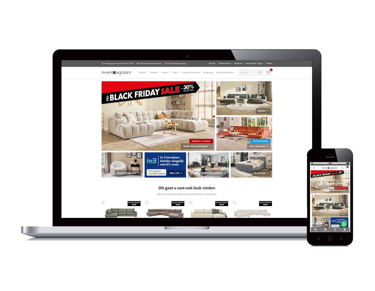 Woonsquare is een bedrijf dat veel werkt met acties, door deze acties te verweven in de hele funnel, word de doelgroep sneller overgehaald om een kijkje te nemen in een winkel. Zo wil je dat in alle kanalen de acties duidelijk overkomen, we hebben onder andere het volgende gedaan: