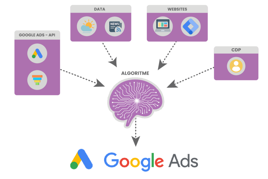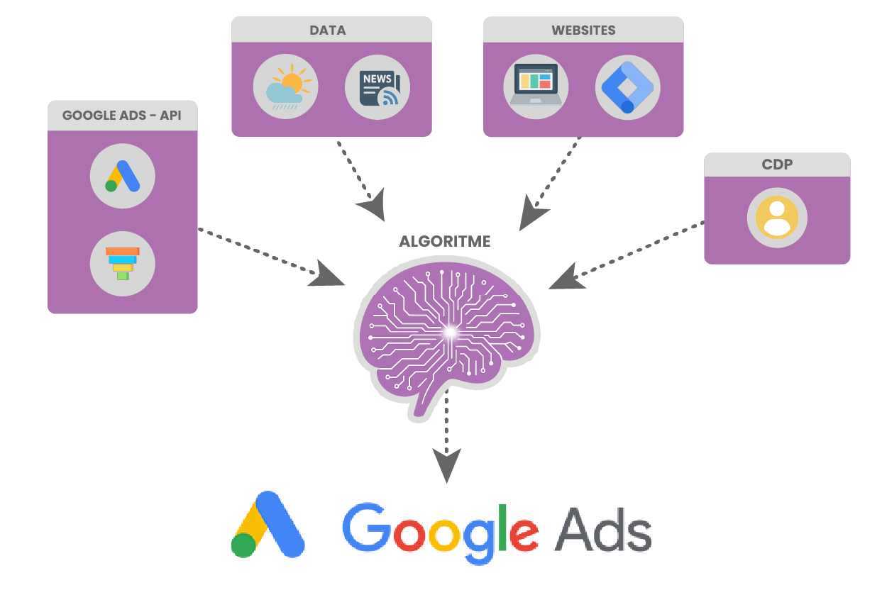 De algoritmes worden primair gevoed door alle data die Google van consumenten bijhoudt via een koppeling met Google Ads API. Aan deze data worden nog verschillende data-bronnen toegevoegd zoals bijvoorbeeld actuele weerdata, klantdata uit onze CDP en uit de scraping van websites van concurrenten.