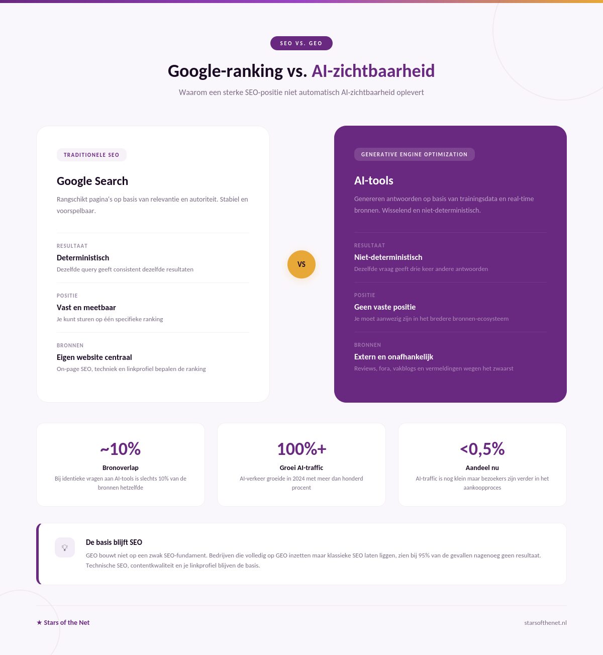 Goed ranken in Google en zichtbaar zijn in ChatGPT of Perplexity zijn twee verschillende dingen. Een sterke SEO-positie vertaalt zich niet automatisch naar zichtbaarheid in AI-antwoorden.