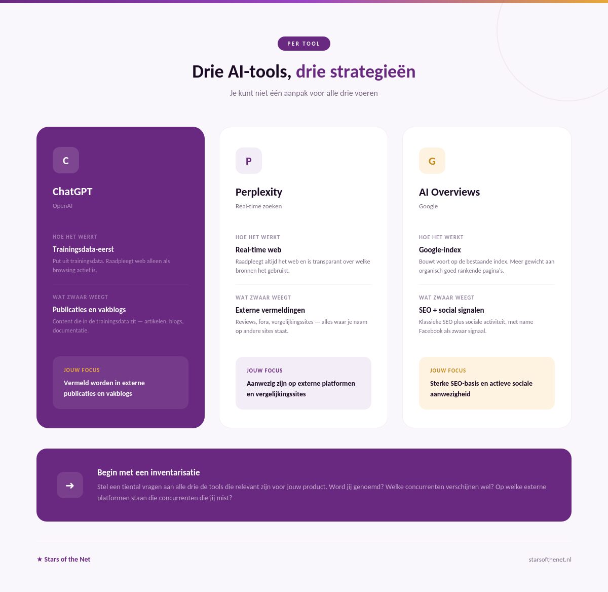 Dit betekent in de praktijk: een strategie gericht op Google AI Overviews overlapt meer met klassieke SEO. Een strategie gericht op Perplexity vraagt meer aandacht voor externe bronnen en vermeldingen op andere websites. Voor ChatGPT is consistente aanwezigheid in publicaties en vakblogs het meest relevant, omdat de trainingsdata daaruit bestaat.